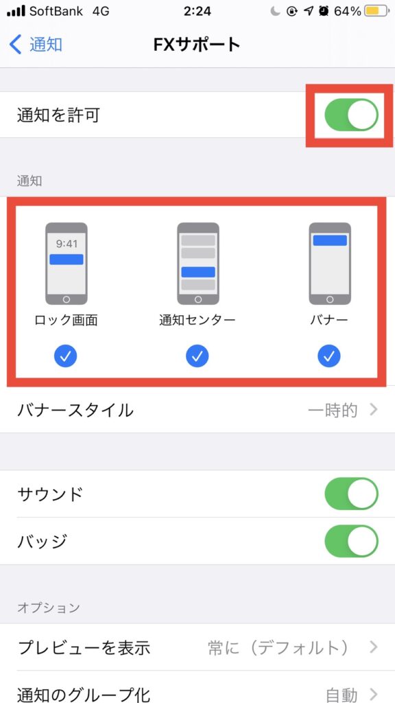 4.「通知」をオンにして、通知の表示方法を選択